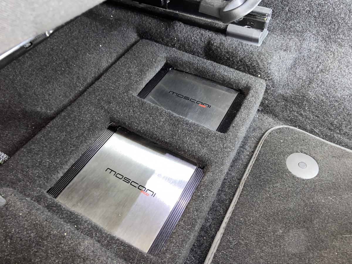 También con una premisa de no ocupar más espacio del imprescindible utilizamos dos amplificadores de la gama Pico de Mosconi, en concreto la Pico 6/8 DSP para los altavoces Gladen Zero delanteros y traseros originales, y una Pico 1 monofónica para el subwoofer SQX 08 al que le construimos un cajón a medida en el lateral del maletero.